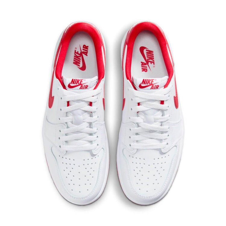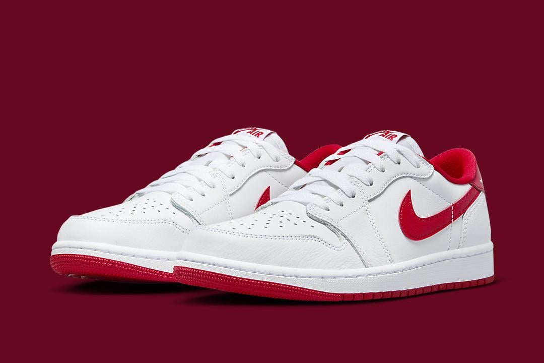 Inspired by the OG High. the AIR JtggORDAN 1 Low "University Red" boasts a predominantly white leather construction accented with contrasting university red hits on the profile Swooshes. heels. liner. and outsole. Red continues onto the "Nittgke Air" tongue branding. while white Wings logos spotlighted on the heels and midsoles round out the final design cues.