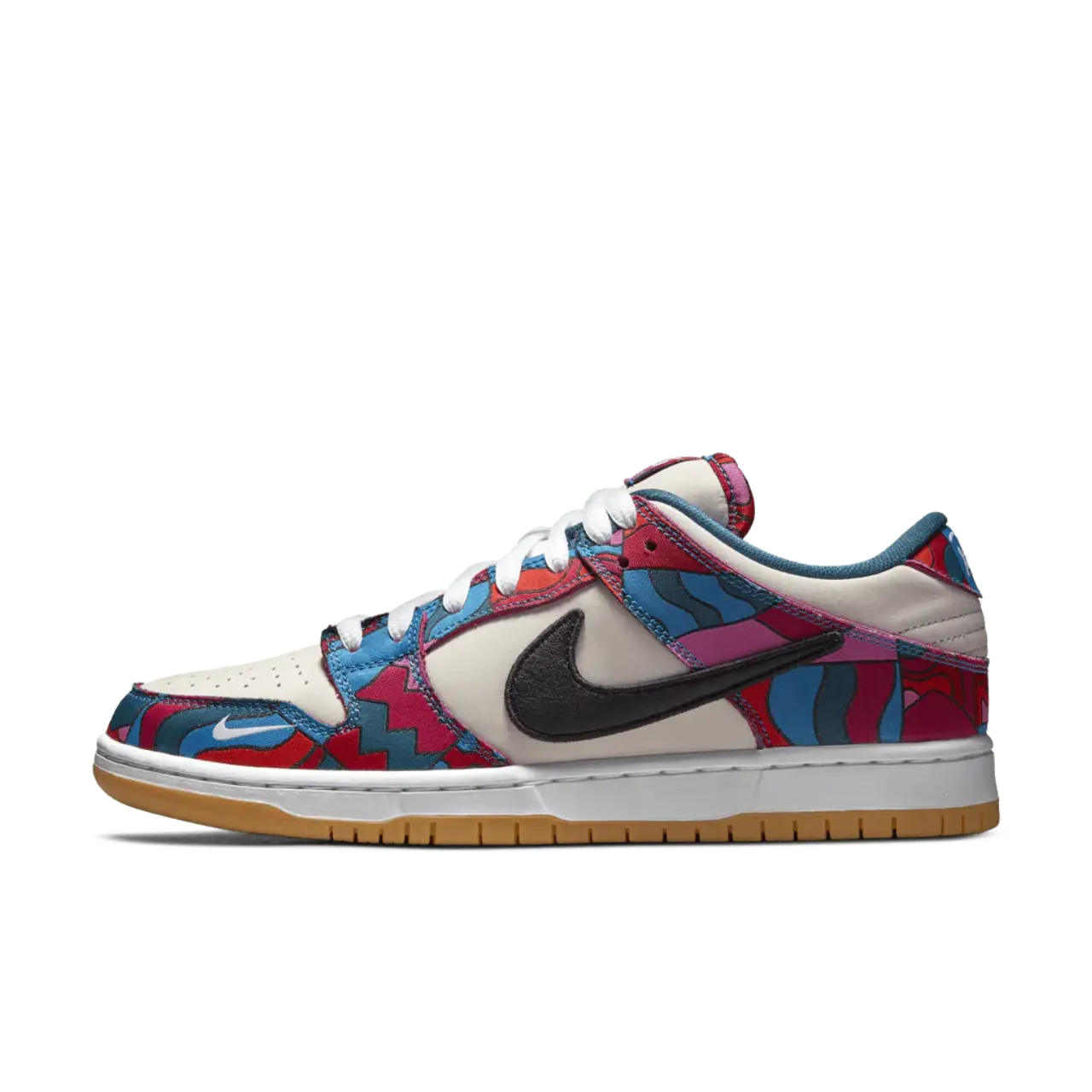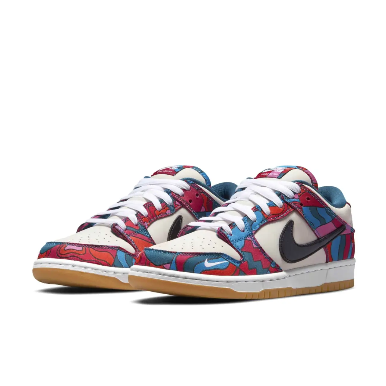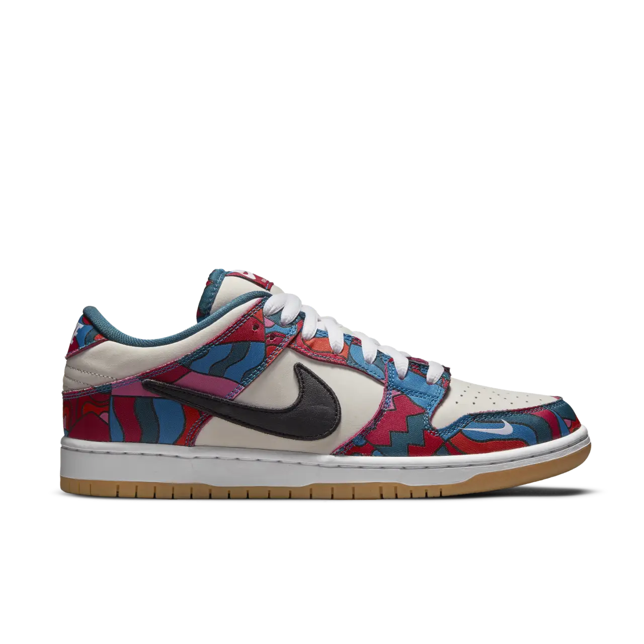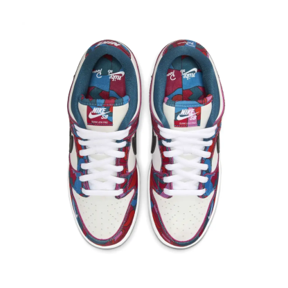 Le Parra x Nike Dunk Low SB sono parte della collezione che rende omaggio alle Olimpiadi estive del 2021 a Tokyo, dove lo skateboarding fa il suo debutto ufficiale. L'artista olandese Piet Parra rielabora le con della pelle color off white con sovrapposizioni in tessuto a stampa astratta in una miscela di tonalità blu, rosso, rosa e verde acqua, un design accattivante ripetuto sui divise della federazione olimpica di SB. Uno Swoosh rimpicciolito in pelle nera adorna il pannello laterale, mentre un mini-Swoosh bianco è ricamato sull'avampiede laterale. Una suola in gomma gommosa offre una trazione duratura sotto i piedi.